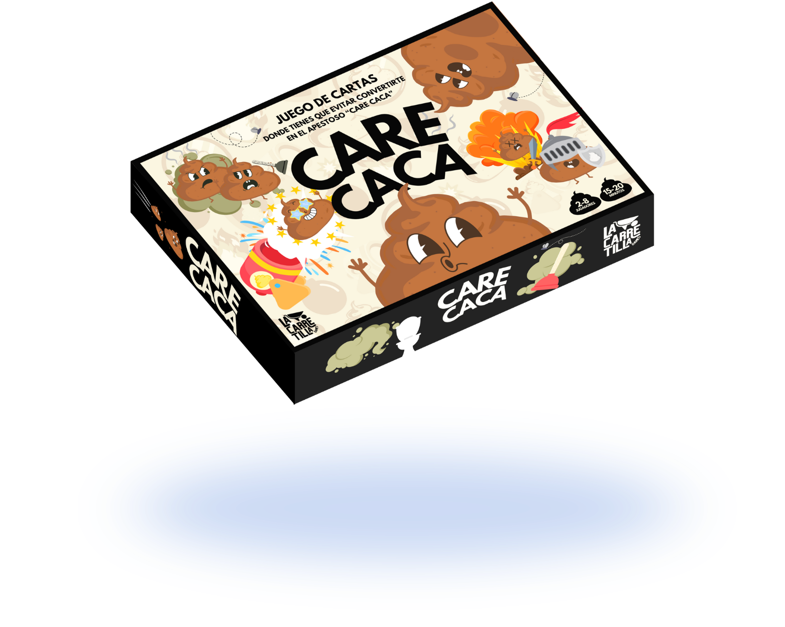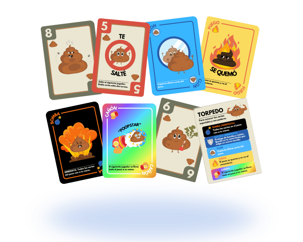 Care Caca es un juego de cartas para jugar entre 2 a 8 personas. Se juega con cartas en la mano y cartas en la mesa (boca arriba y boca abajo). ¡Debes ser rápido! El último que se queda con cartas es el perdedor, a quien llamaremos: El Care Caca.